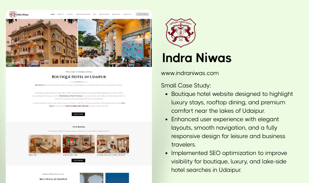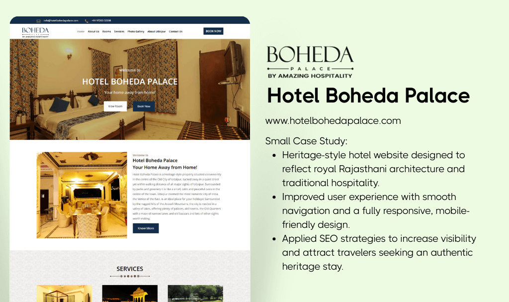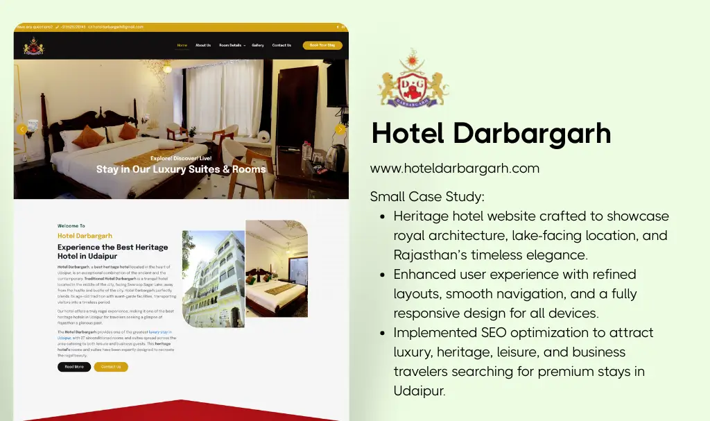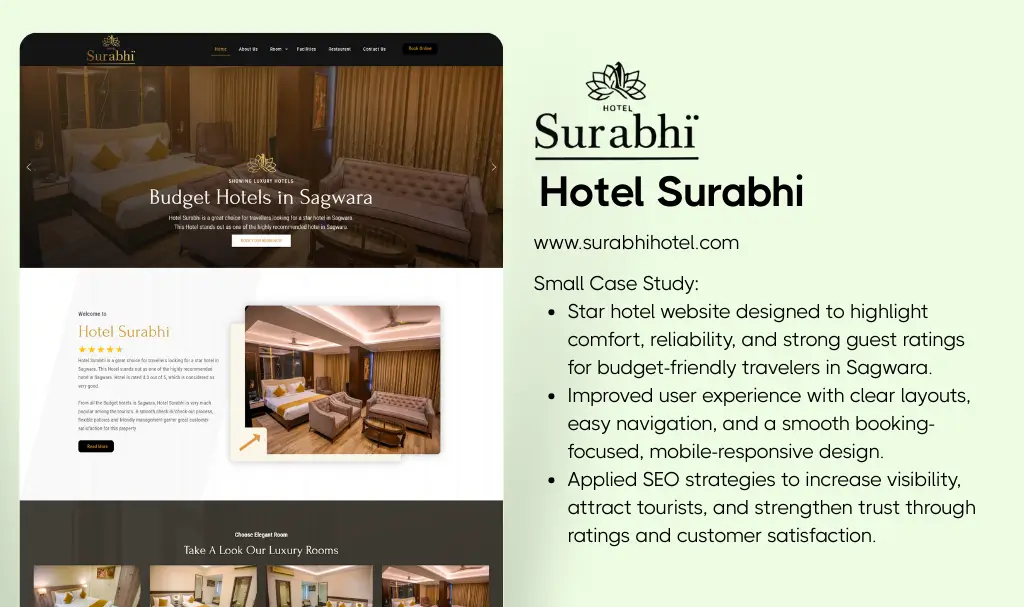 We provide hotel website design and development services for small hotels, new hospitality startups, and growing hotel businesses. Our goal is to create hotel websites that are designed professionally, user-friendly, and support direct bookings.